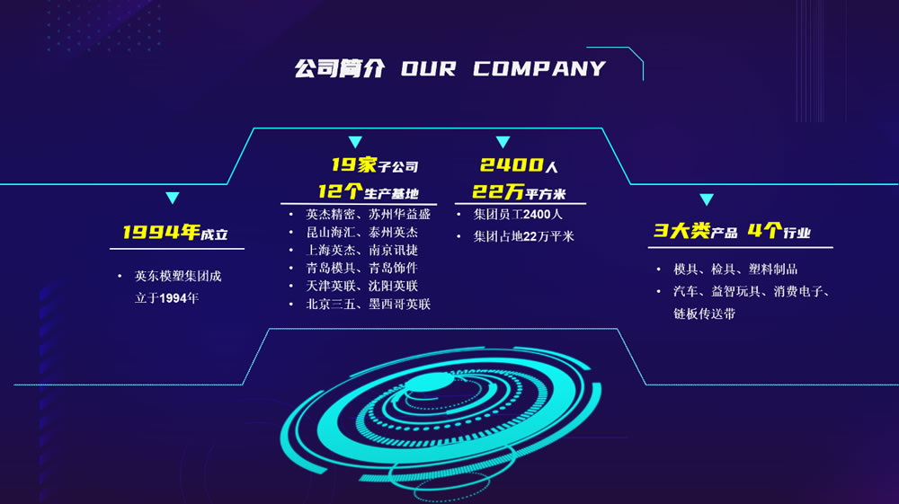 英东集团成立于1994年,在中国大陆及海外拥有19家子公司,12个生产基地,分别位于苏州、昆山、上海、南京、泰州、青岛、天津、沈阳、北京、墨西哥、新加坡等。