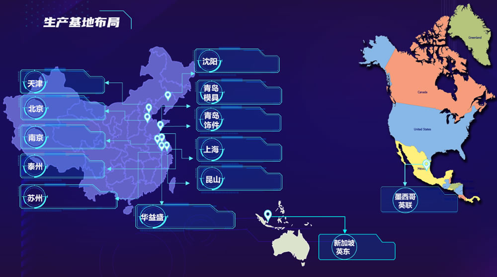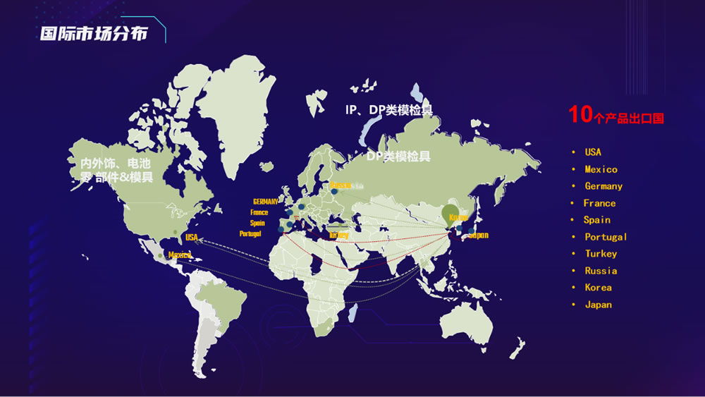 集团主营产品为精密模具、检具、塑料零件。产品涉及汽车、黑白色家电、益智玩具、工业电器等多个行业。客户包含T客户、比亚迪、宝马、陆虎、丰田、马自达、大众、通用、现代、奔驰、弗吉亚、宁德时代、丰田纺织、电装、爱信、延锋彼欧、捷普、布鲁可、索尼、LG、科沃斯、海尔等。产品遍及美国、墨西哥、德国、法国、土耳其、波兰、俄罗斯、日本、英国、西班牙、葡萄牙、印度、南非、泰国、中国等世界各地。